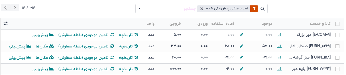 - پیشبینی: تعداد کالایی که پس از در نظر گرفتن تمامی سفارشهای جاری (فروش، تولید، خرید و غیره) موجود خواهد بود.
