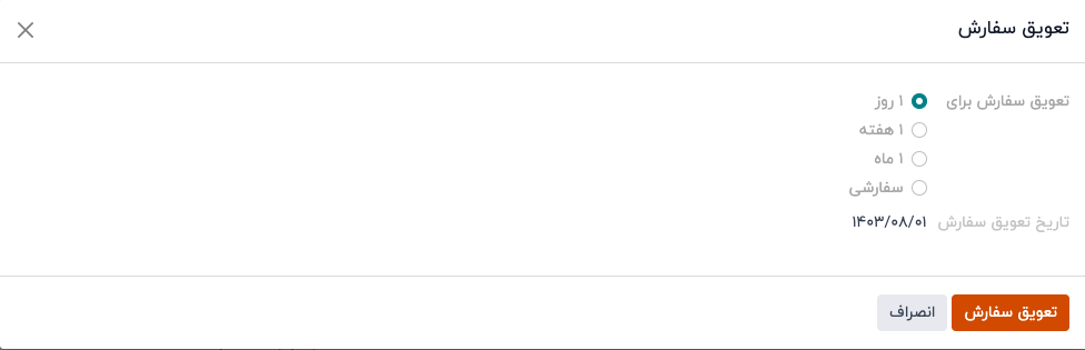 در صفحه تأمین، با کلیک روی نماد 🔕 در سمت چپ سطر میتوان یک قانون نقطه سفارش یا تأمین دستی را به تعویق انداخت.