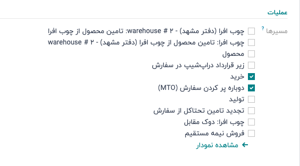 برای کالاهایی که مستقیماً از یک تامینکننده خریداری میشوند، مطمئن شوید که مسیر "خرید" علاوه بر مسیر "دوباره پر کردن سفارش" (MTO) انتخاب شده باشد. همچنین، مطمئن شوید که یک تامینکننده در برگه خرید فرم کالا پیکربندی شده است.