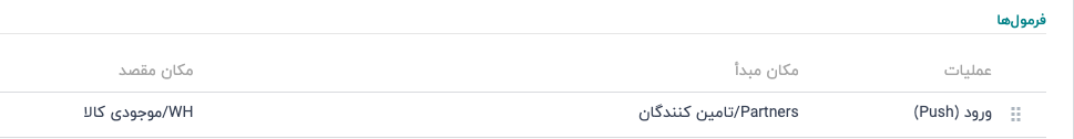 - ورود (Push To): این قانون با ورود محصولات به مکان منبع تعریفشده فعال میشود. زمانی که کاربر محصولات را به مکان منبع انتقال میدهد، اودوو یک عملیات برداشت برای انتقال محصولات به مکان مقصد ایجاد میکند.