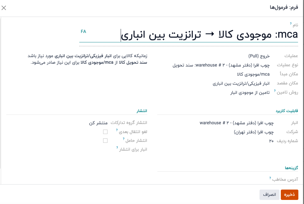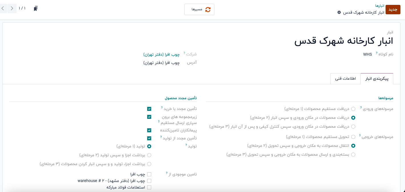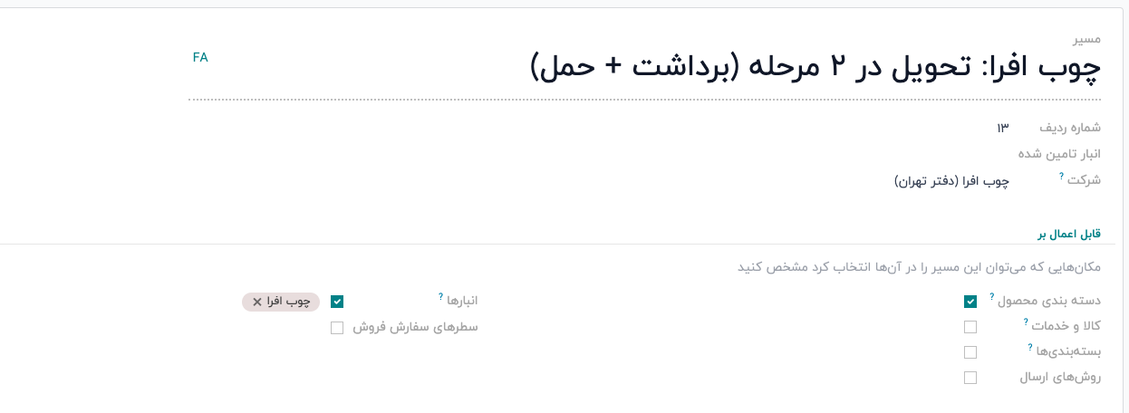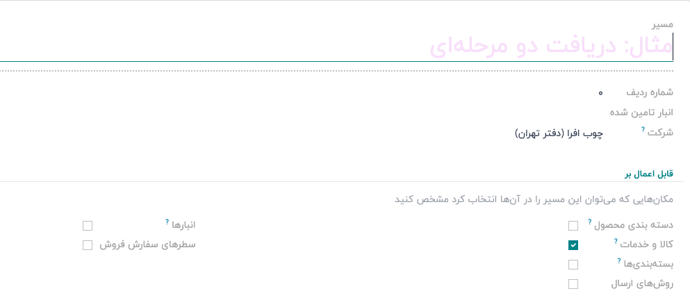 در صفحه مسیرها، با کلیک بر روی یک مسیر، فرم مربوط به مسیر باز میشود. در این فرم، کاربر میتواند مکانهایی که مسیر در آنها اعمال میشود را مشاهده کند. همچنین کاربر میتواند مسیر را برای یک شرکت خاص تنظیم کند. این ویژگی برای محیطهای چندشرکتی مفید است؛ به عنوان مثال، کاربر میتواند یک شرکت و انبار در کشور (یا استان) A و شرکت و انبار دوم در کشور (یا استان) B داشته باشد.