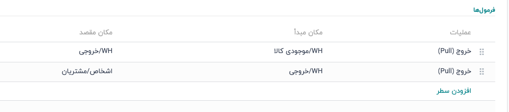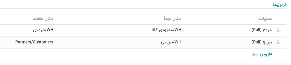 قوانین در فرم مسیر تعریف میشوند. برای انجام این کار، ابتدا به مسیر انبار ‣ پیکربندی ‣ مسیرها بروید و فرم مسیر مورد نظر را باز کنید. سپس روی ویرایش کلیک کرده و در بخش قوانین، روی اضافه کردن یک خط کلیک کنید تا قوانین مورد نظر برای مسیر تعیین شود.