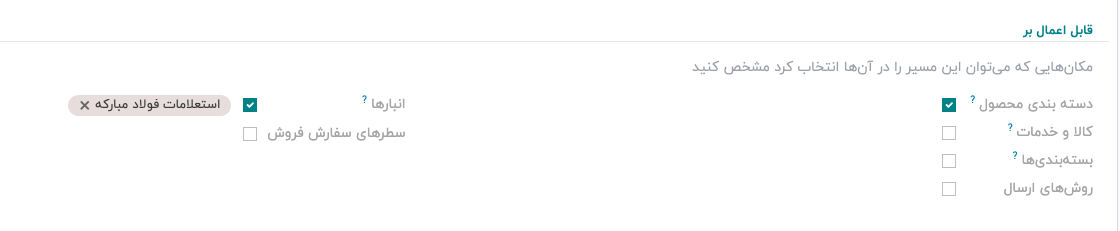 برای ایجاد یک مسیر سفارشی، به انبار ‣ پیکربندی ‣ مسیرها بروید و بر روی ایجاد کلیک کنید. سپس مکانهایی که میتوان این مسیر را در آنها انتخاب کرد، مشخص کنید. یک مسیر میتواند بر اساس ترکیبی از مکانها قابل اعمال باشد.