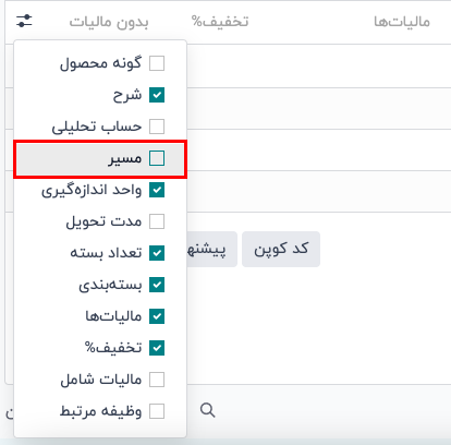 به خاطر داشته باشید که نمایش ستون "مسیر" را در پیشفاکتور/سفارش فروش فعال کنید. سپس میتوانید مسیر را در هر سطر پیشفاکتور یا سفارش فروش انتخاب کنید.