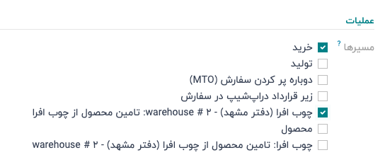 برای تنظیم یک مسیر بر روی محصول، به مسیر انبار ‣ کالا و خدمات ‣ کالا و خدمات رفته و محصول موردنظر را انتخاب کنید. سپس، به تب انبار بروید و در بخش عملیات، مسیرها را انتخاب کنید.