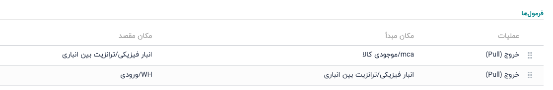 - ورود و خروج (Pull & Push): این قانون اجازه میدهد برداشتها در هر دو حالت ایجاد شوند. به این معنی که وقتی محصولاتی در مکان خاصی مورد نیاز هستند، یک انتقال از مکان قبلی ایجاد میشود تا نیاز را برآورده کند. این عمل یک نیاز در مکان قبلی ایجاد میکند و قانونی فعال میشود تا آن را برآورده کند. هنگامی که نیاز دوم برآورده شد، محصولات به مکان مقصد هل داده میشوند.