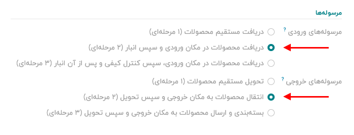 در بخش پیکربندی انبار، تنظیم «دریافتها» را به «دریافت محصولات در مکان ورودی و سپس انبار (2 مرحلهای)» و تنظیم «ارسالها» را به «انتقال محصولات به مکان خروجی و سپس تحویل (2 مرحلهای)» تغییر دهید.
