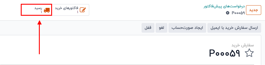 پس از تأیید PO، یک دکمه هوشمند "دریافت" در بالای فرم ظاهر میشود. با کلیک بر روی این دکمه، فرم دریافت انبار (WH/IN) باز میشود.