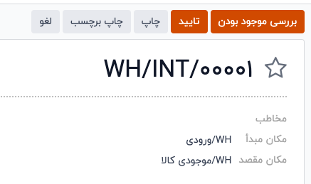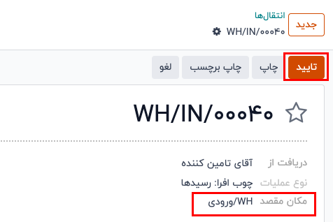 پس از آمادهسازی، روی «تایید» کلیک کنید تا انتقال کامل شود و محصول از WH/Input (ورودی) به WH/Stock (موجودی) منتقل شود.