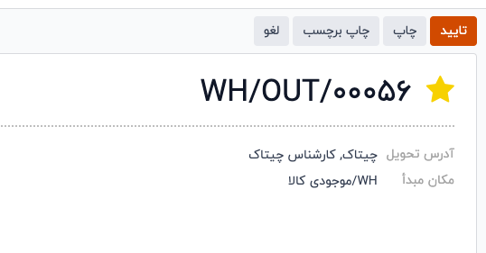 پس از آمادهسازی، روی «تایید» کلیک کنید تا برداشت تکمیل شده و محصول از WH/Stock (موجودی) به WH/Output (خروجی) منتقل شود.