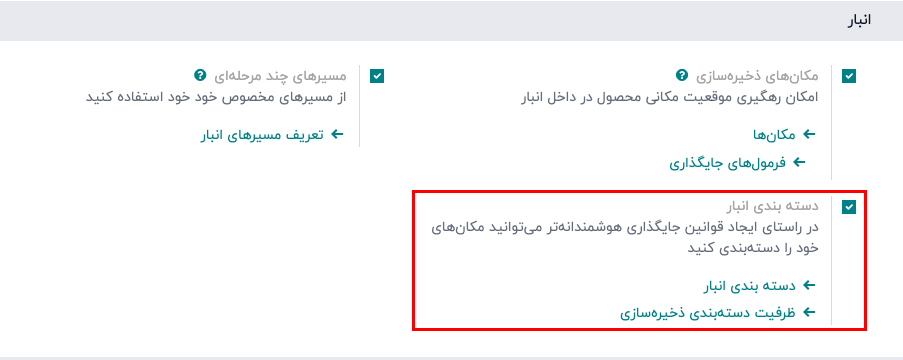 - فعالسازی ویژگی دستهبندی انبار از مسیر برنامه انبار ‣ پیکربندی ‣ تنظیمات.