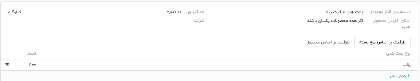 گزینههایی برای محدود کردن ظرفیت بر اساس وزن، کالا و نوع بستهبندی موجود است.