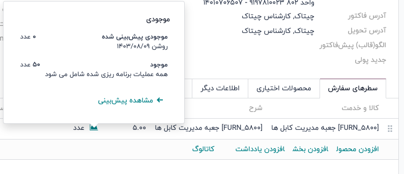 روی آیکون سبز رنگ 📈 (نمودار منطقه) در سطر محصول کلیک کنید تا ابزارک موجودی محصول را مشاهده کنید. این ابزارک تعداد واحدهای رزرو شده برای این سفارش را نشان میدهد. به دلیل تنظیم روش رزرو روی دستی، مقدار رزرو شده برابر با ۰ واحد نمایش داده میشود.