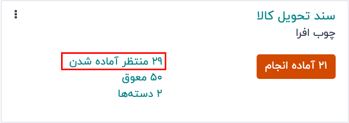 کارت سند تحویل کالا وضعیت جاری سفارشهای فعال را نمایش میدهد، از جمله سفارشهایی که وضعیت در انتظار دارند. سفارشهایی با این وضعیت نشان میدهند که کالاهای آنها هنوز رزرو نشدهاند یا اصلاً در انبار موجود نیستند.