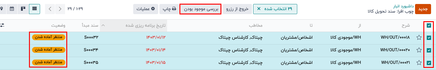 برای رزرو دستی تعداد مشخصشده کالا برای این سفارش، روی دکمه بررسی موجودی در بالای فرم کلیک کنید. با انجام این کار، وضعیت موجودی کالا در فیلد موجودی کالا به رنگ سبز تغییر میکند و تعداد در ستون تعداد با ستون تقاضا مطابقت پیدا میکند.