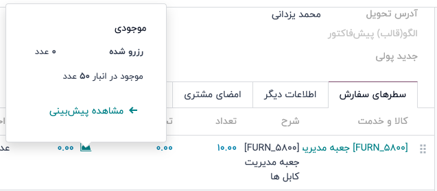 یک مشتری را در فیلد مشتری اضافه کنید، سپس در برگه سطر های سفارش، روی افزودن محصول کلیک کرده و کالایی را از منوی کشویی که زمان آمادهسازی مشتری برای آن پیکربندی شده است، انتخاب کنید تا به فرم پیشفاکتور اضافه شود.