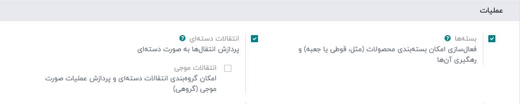 برای فعالسازی برداشت خوشهای، ابتدا به برنامه انبارداری بروید و به مسیر پیکربندی ‣ تنظیمات بروید. در بخش عملیات، گزینههای "بستهها" و "انتقالهای دستهای" را فعال کنید.