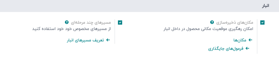 از آنجایی که برداشت انبوه برای بهینهسازی عملیات برداشت در چیتاک استفاده میشود، گزینههای مکانهای ذخیرهسازی و مسیرهای چند مرحلهای در بخش انبار نیز باید در این صفحه تنظیمات علامتگذاری شوند.