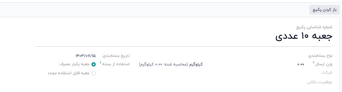 در فرم بسته جدید، شماره شناسایی پکیج بهصورت خودکار با شماره PACK بعدی در سیستم پر میشود. تاریخ بستهبندی نیز بهصورت خودکار به تاریخ ایجاد فرم تنظیم میشود.
