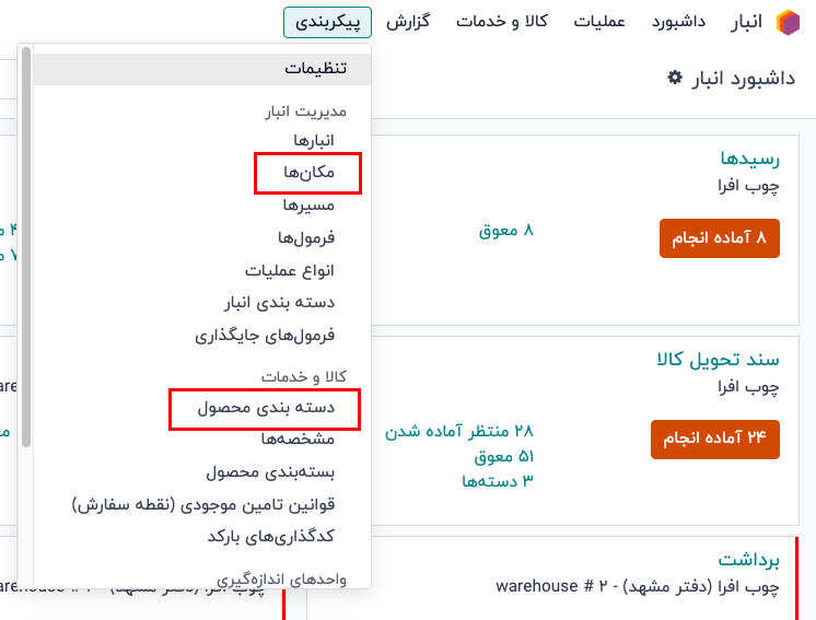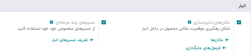 برای فعالسازی این ویژگیها، به انبار ‣ پیکربندی ‣ تنظیمات بروید. در بخش انبار، ویژگیهای مکان نگهداری و مسیرهای چندمرحلهای را فعال کنید.
