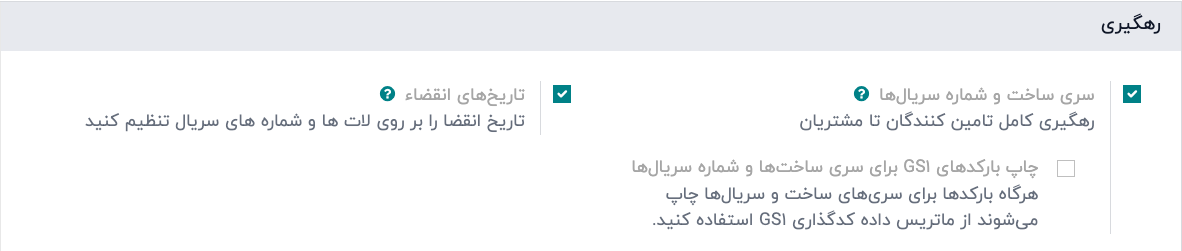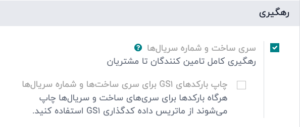 سری ساخت و شمارههای سریال محصولات یکسان را متمایز کرده و اطلاعاتی مانند تاریخهای ورود یا انقضا را ردیابی میکنند. برای فعالسازی این ویژگی، به انبار ‣ پیکربندی ‣ تنظیمات بروید. در بخش رهگیری، کادر کنار گزینه سری ساخت و شمارههای سریال را تیک بزنید تا این ویژگی فعال شود.