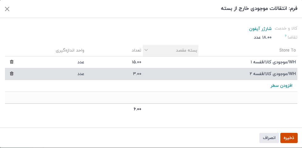 در پنجره "فرم: انتقالات موجودی خارج از بسته"، فیلد "برداشت از" نشان میدهد که کالاها برای برآورده کردن تقاضا از کجا برداشت شدهاند. تمام پانزده واحد موجود در نزدیکترین مکان، یعنی WH/موجودی کالا/قفسه 1، ابتدا برداشت میشوند. سپس سه واحد باقیمانده از مکان دوم نزدیکتر، یعنی WH/موجودی کالا/قفسه 2، انتخاب میشود.