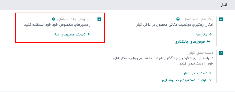چیتاک به طور پیشفرض برای دریافت و تحویل کالاها در یک مرحله پیکربندی شده است، بنابراین تنظیمات باید تغییر کند تا از دریافت سهمرحلهای استفاده شود. ابتدا اطمینان حاصل کنید که گزینه "مسیرهای چندمرحلهای" در بخش انبار ‣ پیکربندی ‣ تنظیمات ‣ انبار فعال شده است. توجه داشته باشید که فعالسازی مسیرهای چندمرحلهای، مکانهای ذخیرهسازی را نیز فعال خواهد کرد.