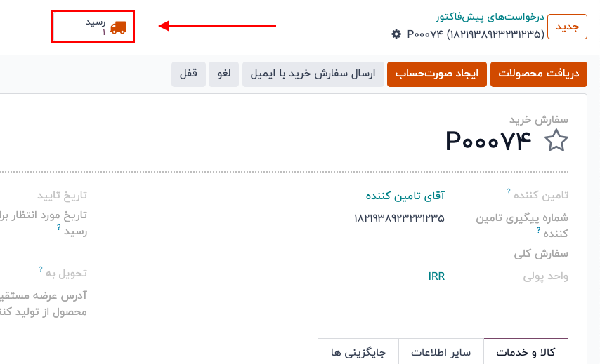 یک دکمه هوشمند "دریافت" در گوشه بالای سمت راست ظاهر میشود و دریافت با سفارش خرید مرتبط خواهد شد. با کلیک بر روی دکمه هوشمند "دریافت"، سفارش دریافت نمایش داده میشود.