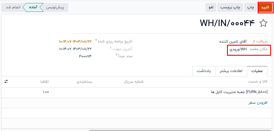 روی "تایید" کلیک کنید تا دریافت تایید شده و محصول به مکان مقصد، WH/Input منتقل شود.