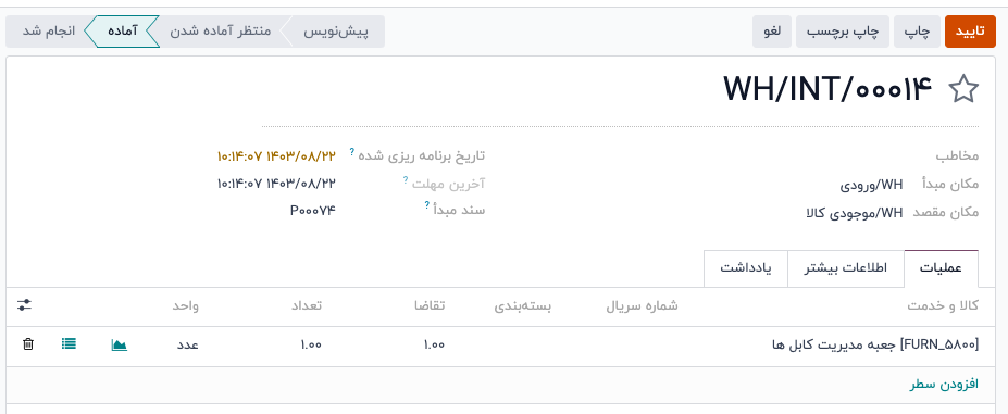 پس از تایید رسید، عملیات انتقال داخلی برای جابجایی محصول به بخش کنترل کیفیت آماده پردازش است.