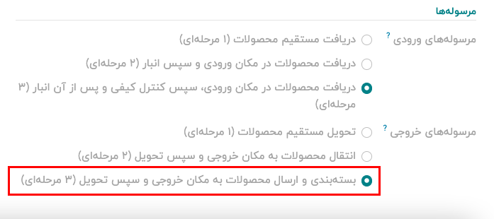 برای تغییر تنظیمات تحویل از یک مرحله به سه مرحله، مطمئن شوید که گزینه "مسیرهای چندمرحلهای" در برنامه انبار ‣ پیکربندی ‣ تنظیمات ‣ انبار فعال شده باشد. توجه داشته باشید که فعال کردن مسیرهای چندمرحلهای، مکانهای ذخیرهسازی را نیز فعال میکند.