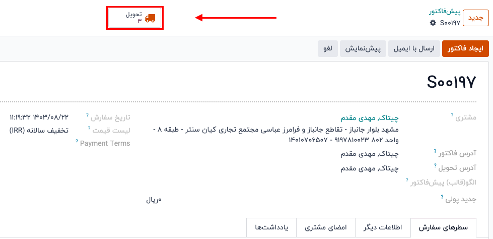 پس از تایید سفارش تحویل، کالا از مکان WH/خروجی به مکان اشخاص/مشتریان منتقل میشود. سپس، وضعیت سند به "انجام شده" تغییر میکند.
