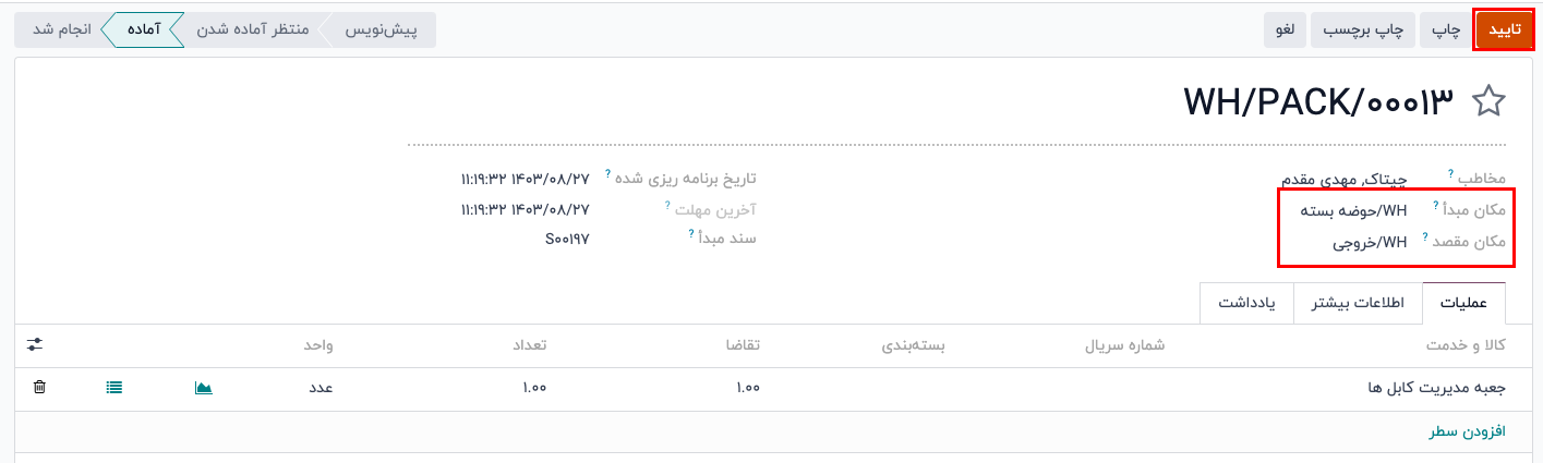 پس از تایید سفارش بستهبندی، محصول از موقعیت WH/بسته بندی به موقعیت WH/خروجی منتقل میشود. سپس، وضعیت سند به "انجامشده" تغییر خواهد کرد.