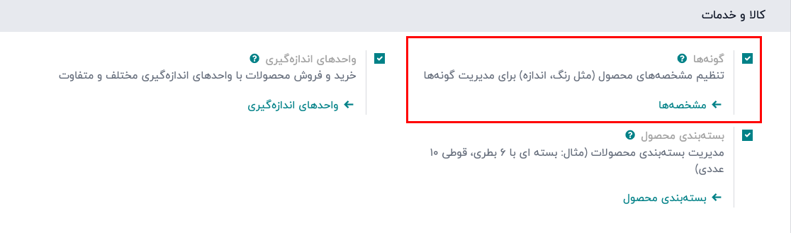 برای فعالسازی ویژگی گونههای کالا، به برنامه انبار ‣ پیکربندی ‣ تنظیمات بروید و به بخش کالا و خدمات اسکرول کنید. سپس، گزینه «گونهها» را فعال کرده و برای اعمال تنظیمات، روی «ذخیره» کلیک کنید.