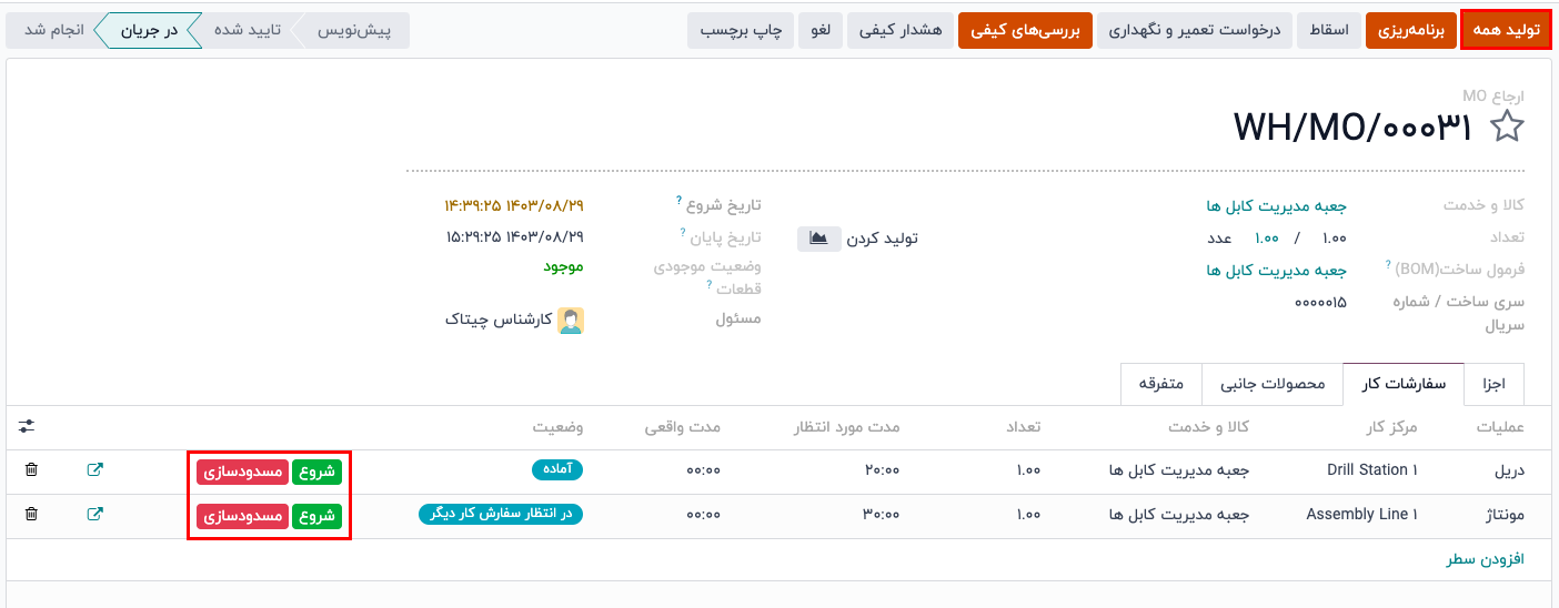 همچنین میتوانید برای تکمیل سفارش، روی دکمه «تولید همه» در بالای فرم سفارش تولید کلیک کنید.