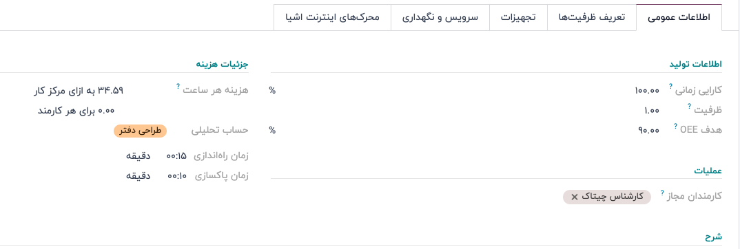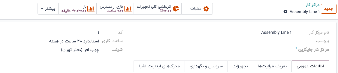 برای تخصیص تجهیزات به مرکز کار، از تب تجهیزات استفاده میشود. اطلاعات زیر برای هر قطعه تجهیزاتی که اضافه میشود نمایش داده میشود: