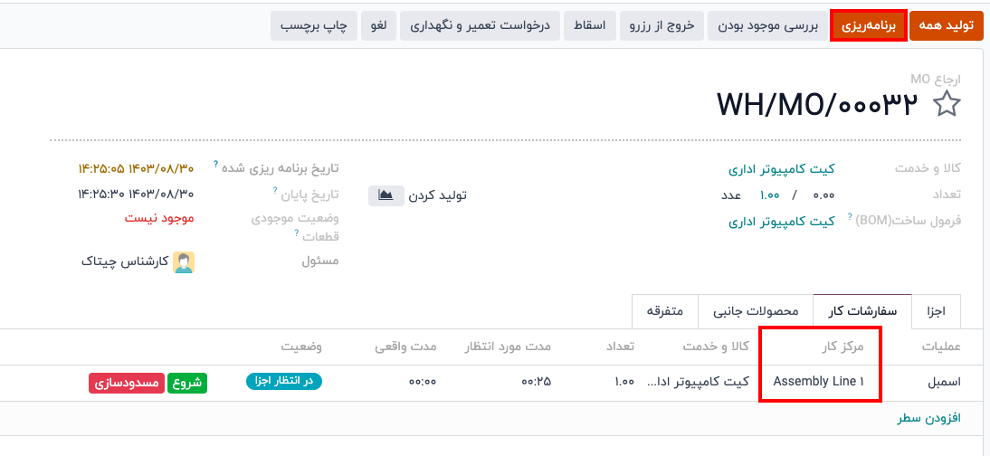 حال، یک سفارش تولید جدید ایجاد کنید که از مرکز کار اصلی برای یکی از عملیاتهای خود استفاده کند. مرکز کار اصلی به طور خودکار برای عملیات در تب "سفارشات کار" انتخاب خواهد شد. پس از تایید سفارش تولید، روی دکمه "برنامهریزی" که در بالای سمت چپ فرم ظاهر میشود کلیک کنید.
