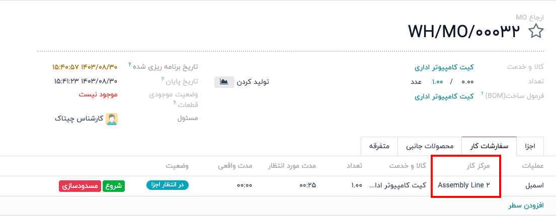 چیتاک تولید به شما این امکان را میدهد که سفارشهای کار را در مراکز کار مشخص انجام دهید. زمانی که برای یک کالا سفارش تولید ایجاد میشود، هر سفارش کار که در برگه عملیات فرمول ساخت کالا ذکر شده باشد، به صورت خودکار ایجاد و به مرکز کار مشخصشده اختصاص داده میشود. مدیریت سفارشهای کار در ماژول تولید از طریق مسیر عملیات ‣ سفارشات کار امکانپذیر است.