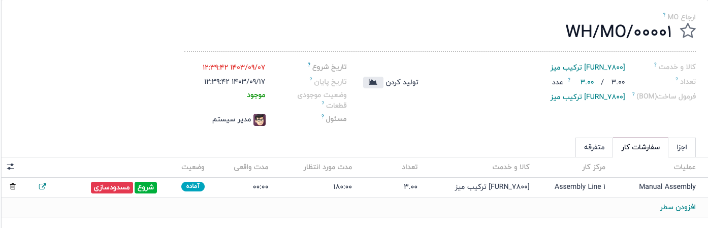 - مسیر عملیات ‣ سفارشهای تولید ‣ جدید را دنبال کنید.