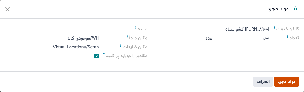 چکباکس مقادیر را دوباره پر کنید را فعال کنید اگر میخواهید یک سفارش برداشت برای جایگزینی جزء (های) اسقاط شده پس از تایید سفارش ضایعات ایجاد شود. این گزینه باید فقط برای انبارهایی که تولید دو مرحلهای یا سه مرحلهای فعال دارند، فعال شود، زیرا در فرآیند تولید یک مرحلهای، اجزاء به صورت دستی برداشت نمیشوند.