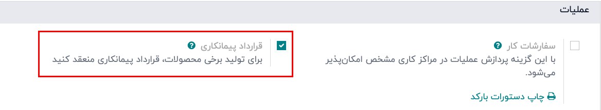 برای فعالسازی قرارداد پیمانکاری در چیتاک، وارد برنامه تولید ‣ پیکربندی ‣ تنظیمات شوید، و تیک گزینه قرارداد پیمانکاری را در بخش عملیات بزنید. سپس ذخیره را کلیک کنید.