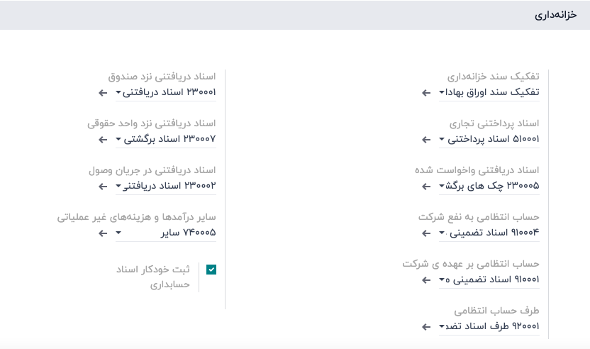 در صورتی که کدینگ برنامه حسابداری شما به صورت کامل ایجاد شده ، از این قسمت میتوانید حساب های مورد نیاز در خصوص پیکربندی برنامه خزانه داری انجام دهید.