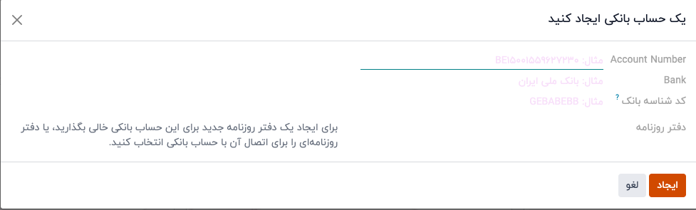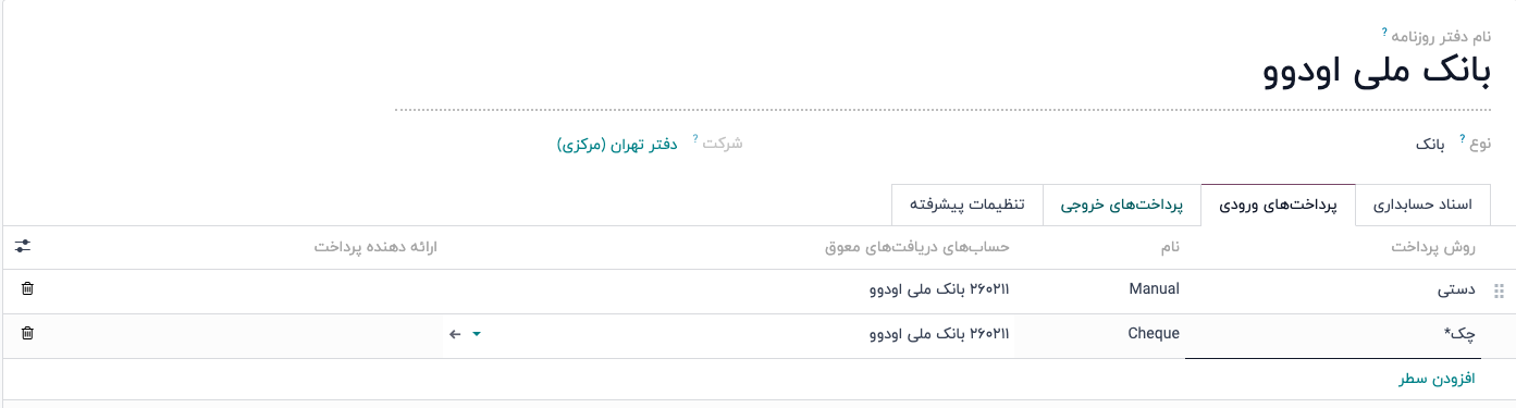 در خصوص ایجاد حساب بانکی ، از منوی حسابداری > پیکربندی > افزودن حساب بانکی اقدام نمایید: