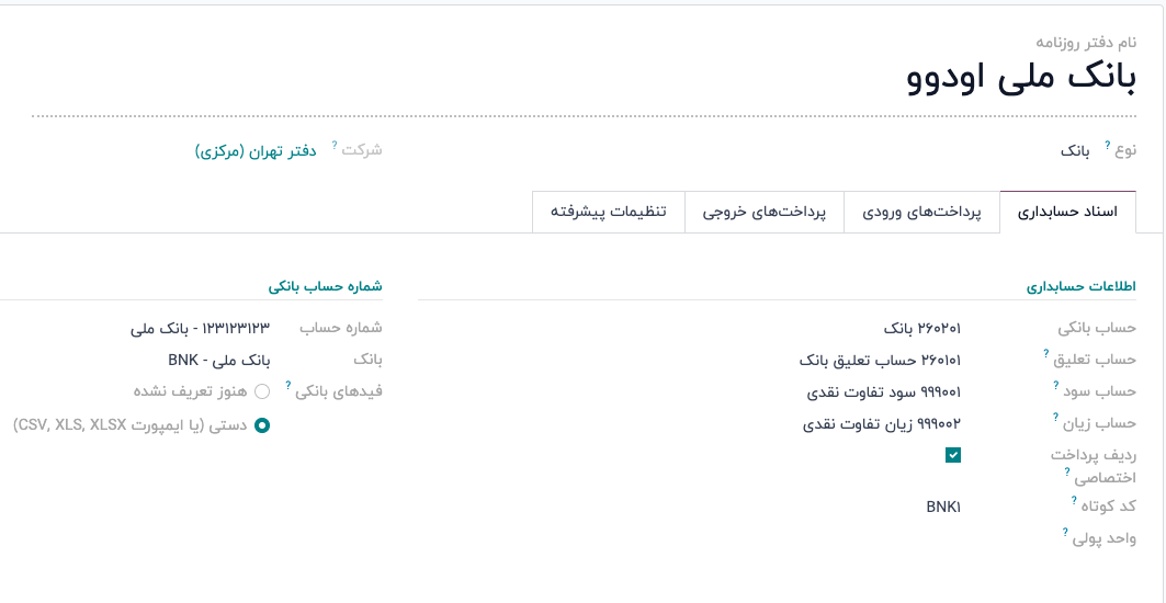 حال در خصوص پیکربندی بانک در خصوص ثبت اسناد مالی و خزانه داری، به تب های پرداخت های ورودی و خروجی مراجعه