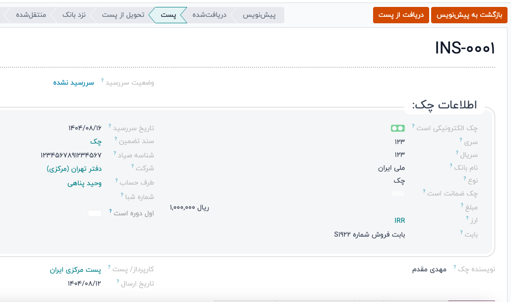 - کارپرداز/پست: چک به کدام. یک از شرکت/اشخاص پستی تحویل شده است. (باید در برنامه مخاطبان ثبت شده باشند)
