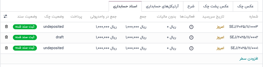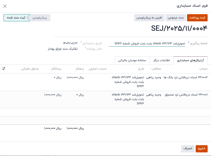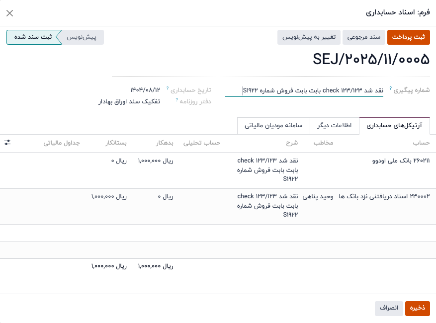 پس از نقد شدن چک، سند نقد شدن به صورت خودکار شده و حساب های بانک و اسناد دریافتنی درگیر می شوند.