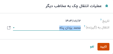 پاپ اپ انتقال چک نمایان شده و درخواست تاریخ و شخص مورد نظر را از کاربر می کند: