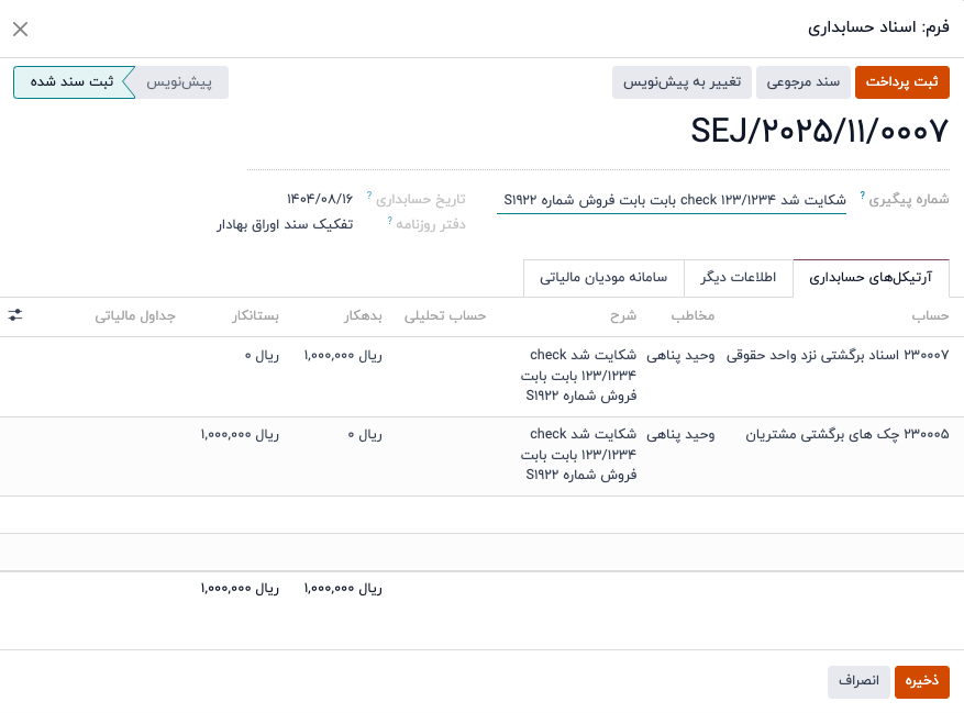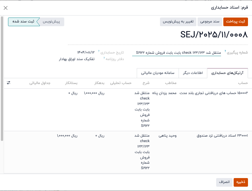 با کلیک برروی هر کدام از اسناد ثبت شده ، می توانید مقادیر را تغییر داده و آرتیکل های سند را مشاهده نمایید: