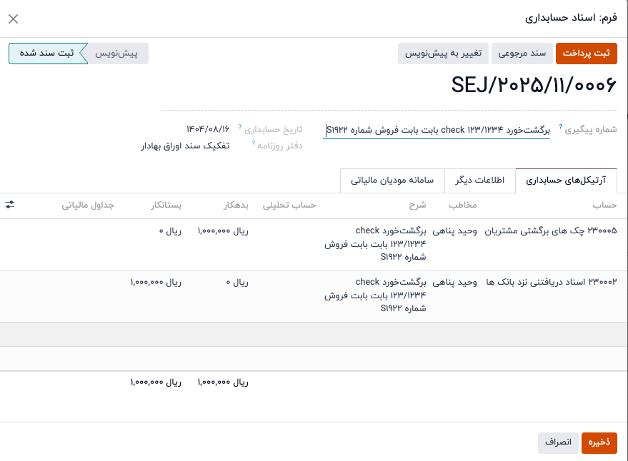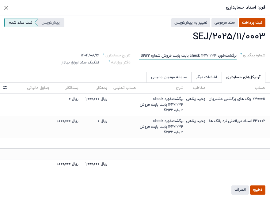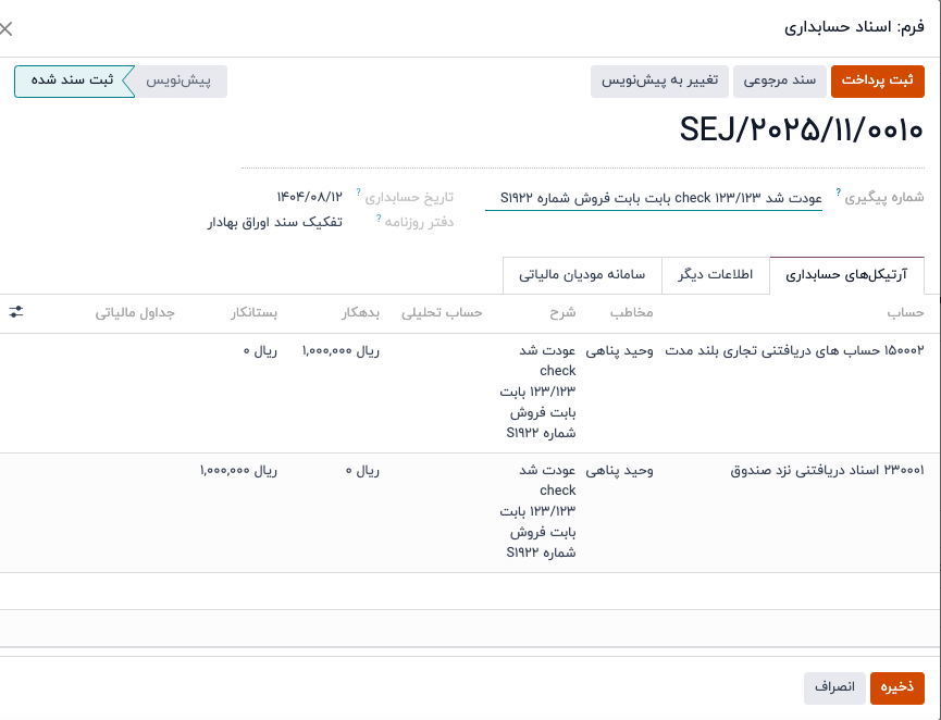 سند ثبت شده در خصوص عودت چک با سند اولیه که در دریافت چک ثبت شده تراز می گردد: