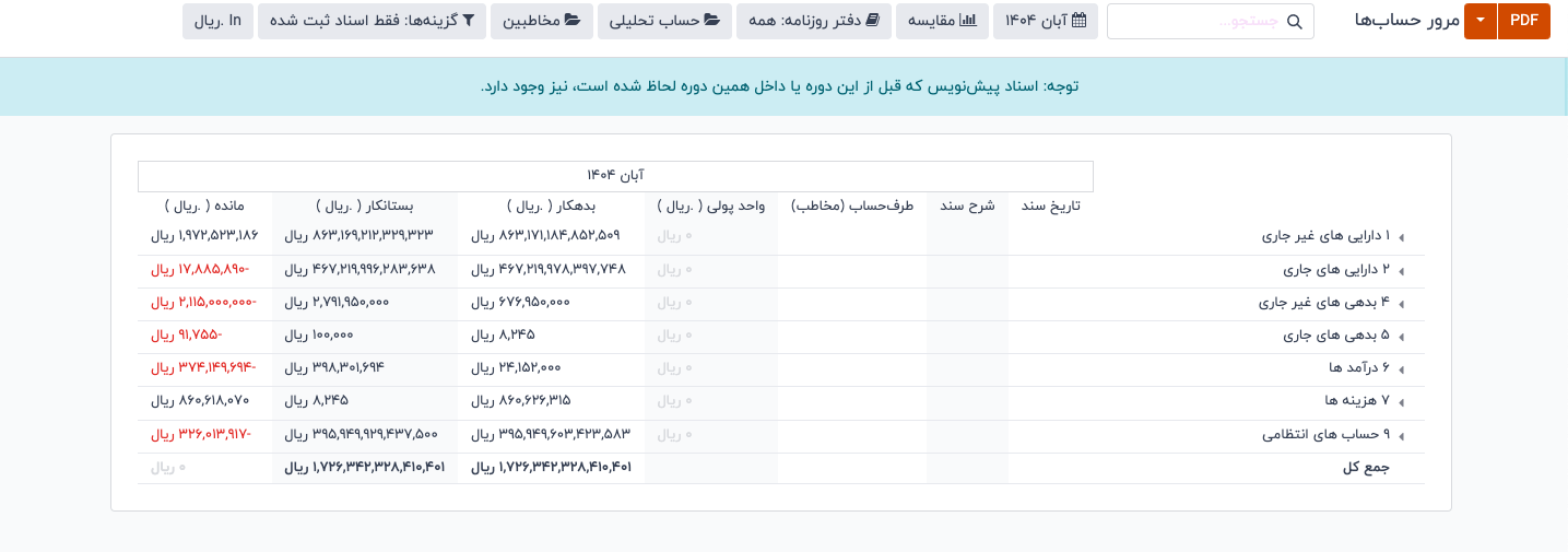 هدف گزارش مرور حساب ها، دیدن مانده و گردش حسابهای مرتبط با بانک، صندوق، چکهای دریافتی و پرداختی و حسابهای موقت/معوق است تا بتوانید سریع وضعیت نقدینگی و اسناد در جریان را بررسی کنید.